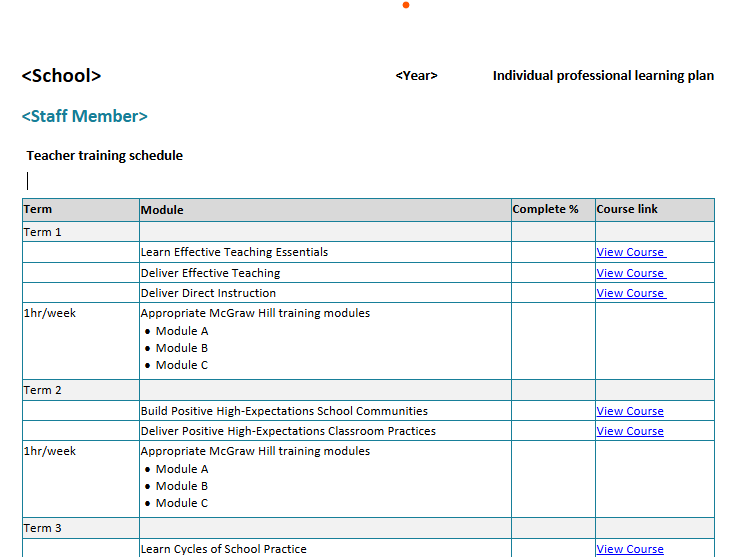 School Professional Learning PlanThe School Professional Learning Plan outlines the professional learning and training to be completed by each faculty member across the year, including scheduled timelines for completion. |
