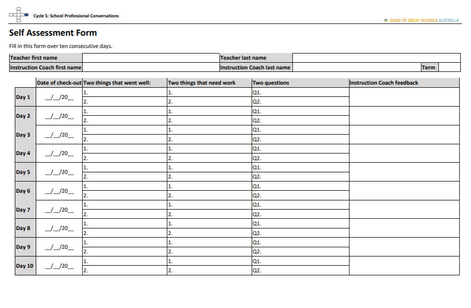 Self-Assessment FormThe Self-Assessment Form enables Teachers and Instruction Coaches to conduct self-assessments based on professional conversations over ten consecutive school days. |
