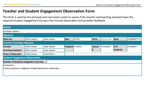 Teacher and Student Engagement Observation FormThe Teacher and Student Engagement Observation Formis used by the principal and instruction coach to assess if the teacher and teaching assistant have the required student engagement during a five-minute observation and provides feedback. |
