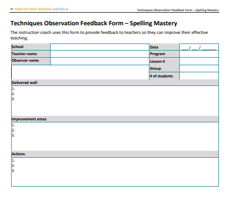 Techniques Observation FormThe Techniques Observation Form supports principals and instruction coaches in observing teaching techniques during classroom practice. It is used to record observations and guide feedback and coaching conversations. |