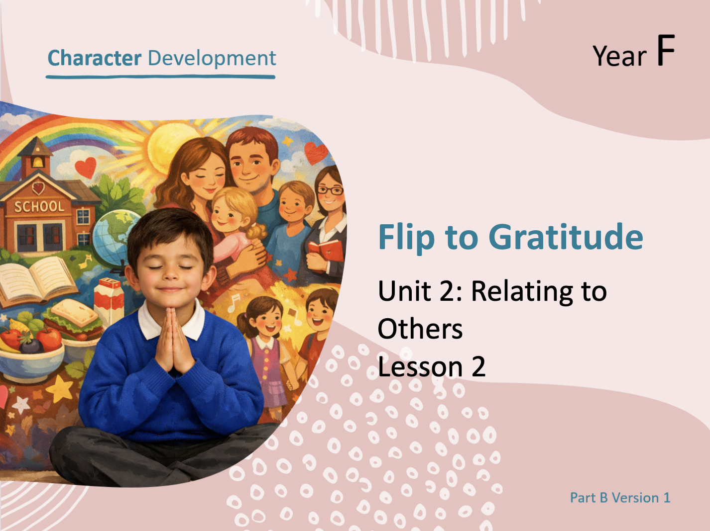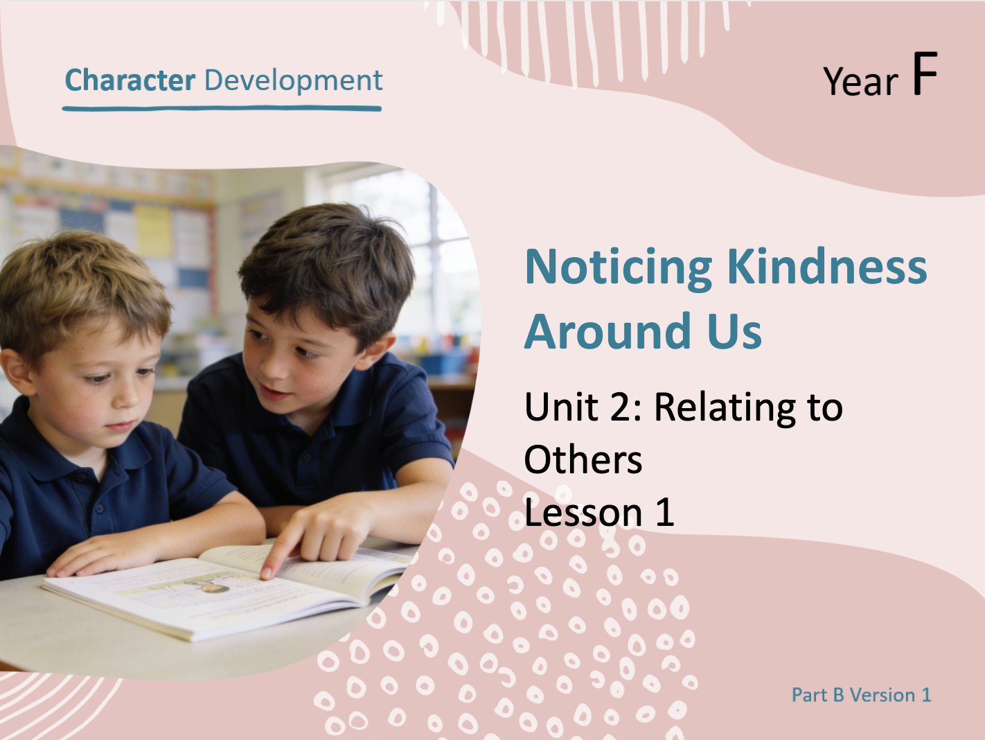This unit focuses on helping Foundation students build positive relationships by explicitly teaching the character traits of kindness, gratitude and passion. Students learn to notice others’ needs and choose helpful actions, recognise and express appreciation for people and positive experiences, and develop persistence by staying engaged with activities even when they become challenging. Together, these traits support a safe, friendly and cooperative classroom environment.