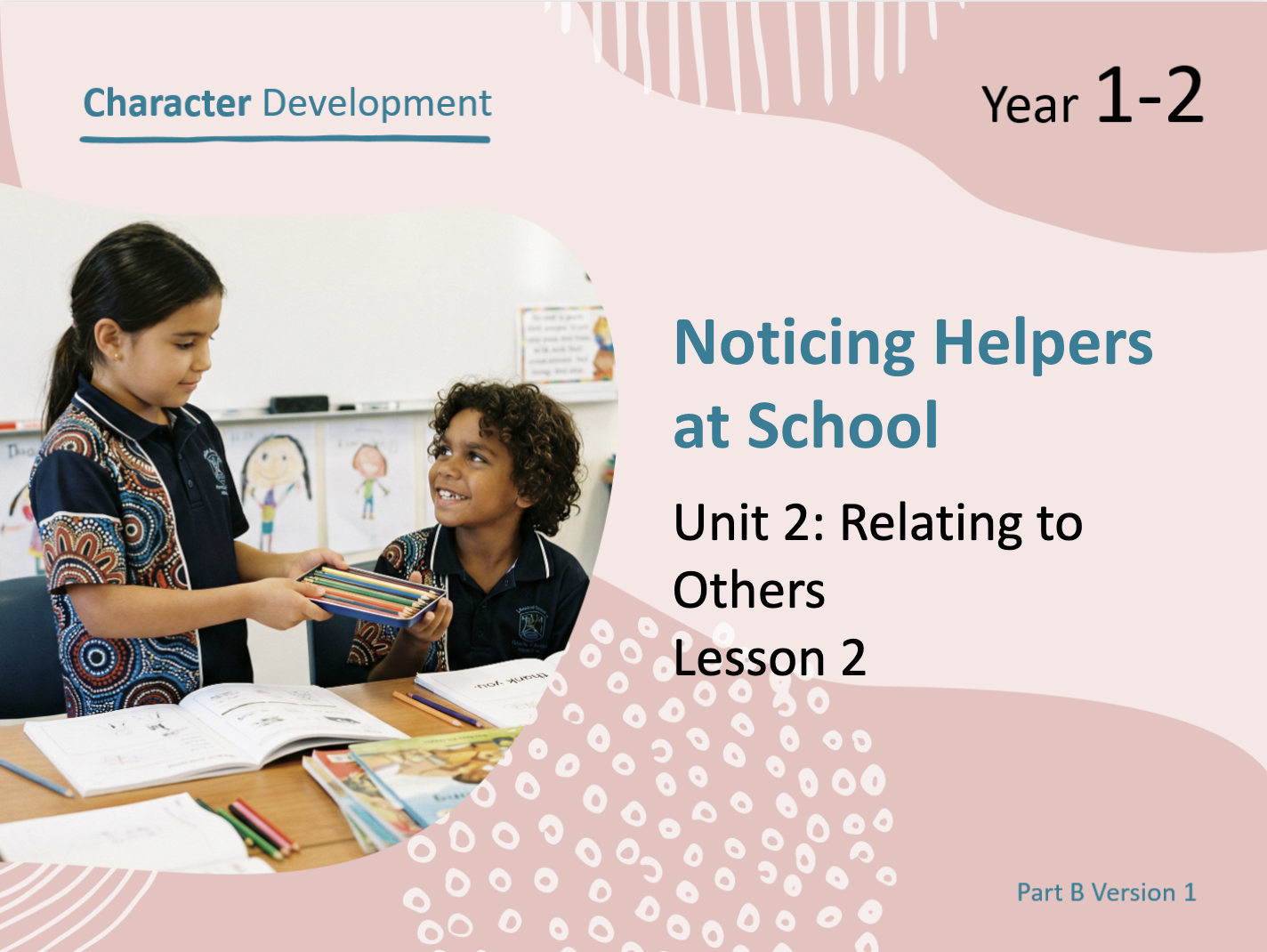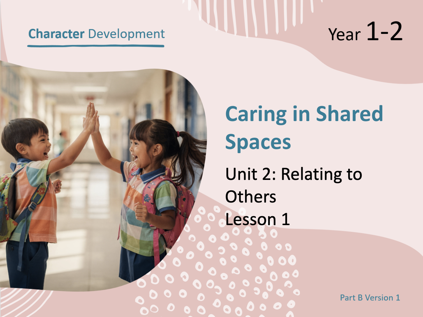 In this unit, students learn how to use kindness, gratitude and passion to care for the shared spaces in their school. Through discussions, visual scenarios, partner tasks, role-play and real-life helping jobs, students identify problems in places such as the classroom, library, playground, hallway and eating area, and explore how they can respond in thoughtful and helpful ways.