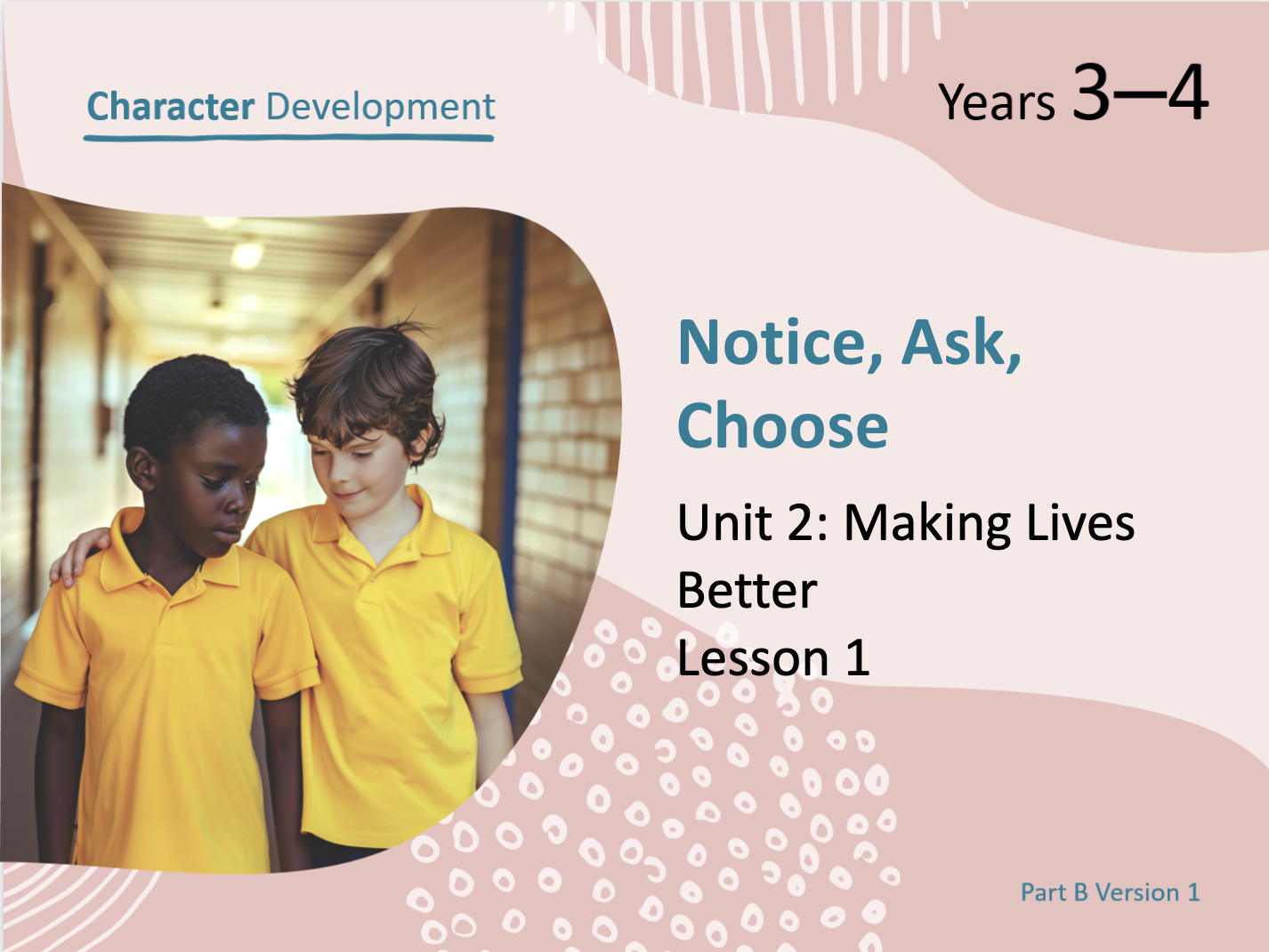 In this unit, students explore how kindness, gratitude and passion work together to make lives better. Through real-life examples, class discussions and practical tasks, they learn how noticing what they have can help them recognise needs in others and how caring about something can help them act with purpose.